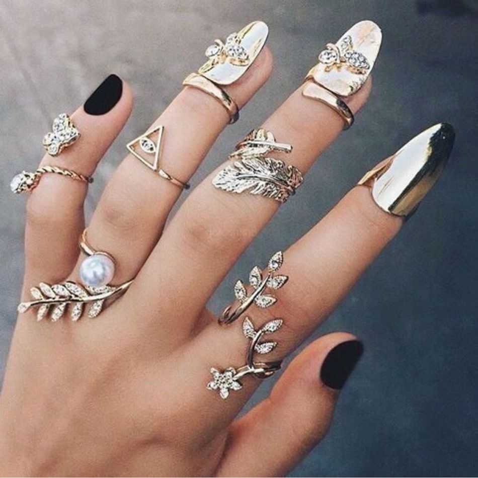 - Лучше всего, если украшения будут тоненькими, небольших размеров. Очень часто их компонуют на одном пальце, чередуя между собой. Сейчас очень много подобных изделий не из драгоценных металлов, а из меди или железа. Их симпатично миксуют между собой, дополняя довольно скромные наряды.