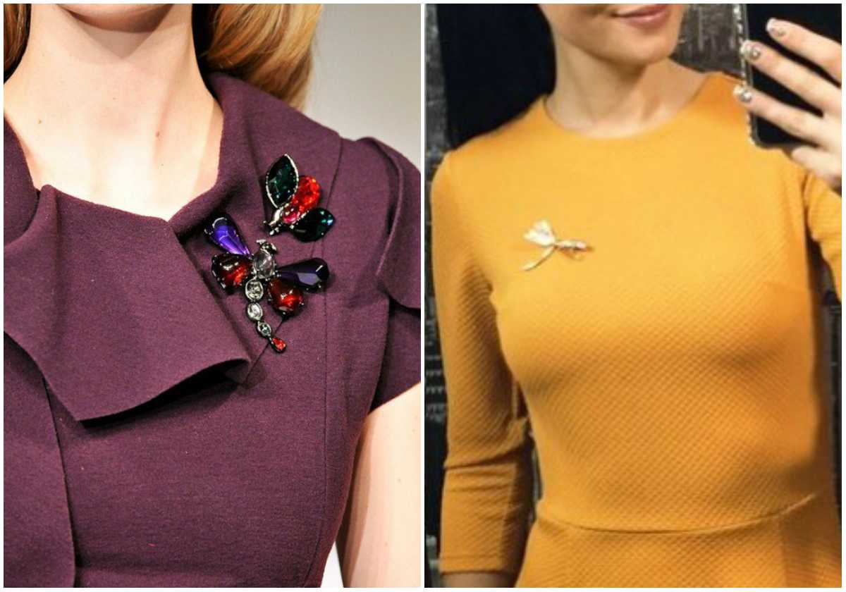 Например, брошь в виде стрекозы – как носить ее, чтобы не выглядеть инфантильно? Выбирайте более абстрактные и схематические модели. Сочетание камней разных цветов подойдет только для простых образов, а изящные скромные стрекозы уже менее требовательны.