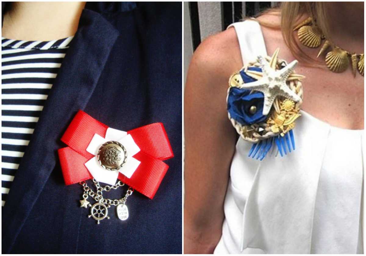 А с чем носить броши в морском стиле, которые тоже популярны летом? Ответов много – пиджаки, жилеты, платья, футболки, блузки в морской цветовой гамме. Ко всему перечисленному брошка в соответствующем стиле подойдет прекрасно.