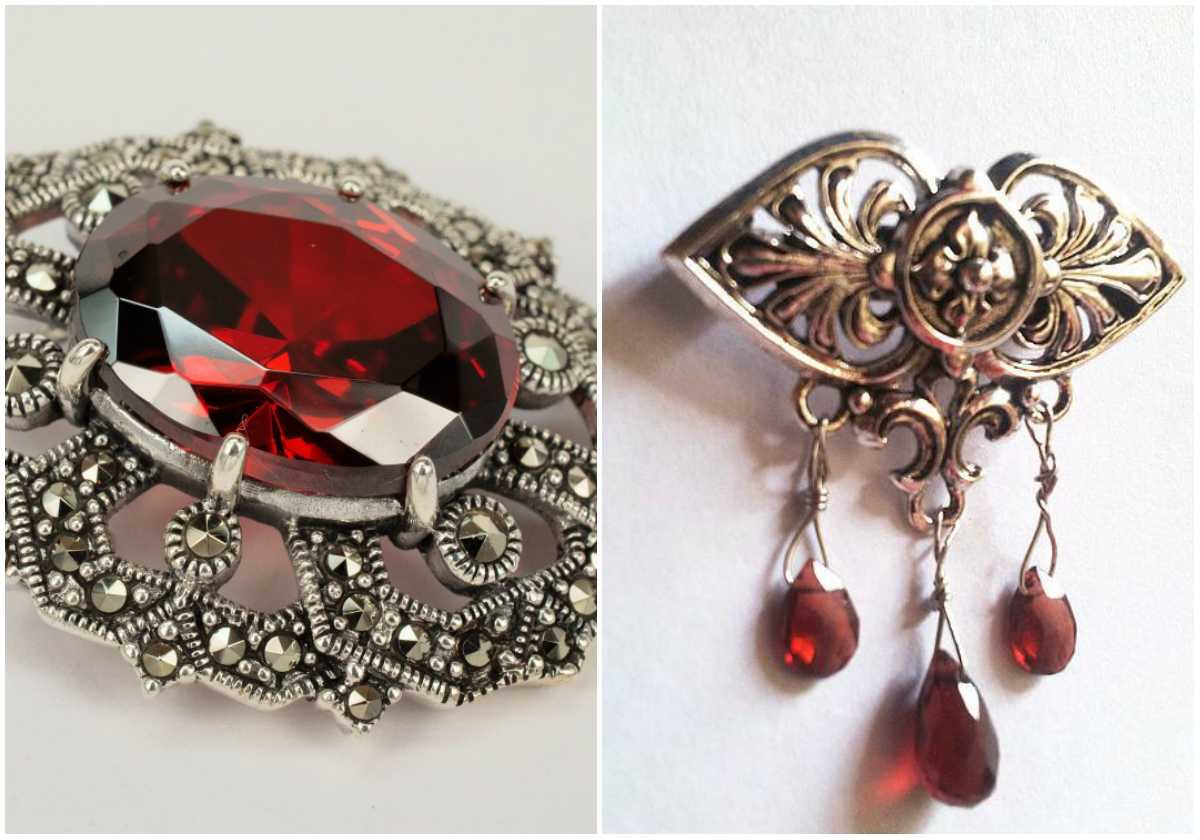 И, наконец, с чем носить гранатовую брошь? Сам цвет и специфика такой броши подсказывают нам, что образ должен быть либо официозным, либо чопорно-торжественным, либо вечерним. Отлично подчеркнет платье другого красного оттенка, а также наряды черного и сливового цветов.