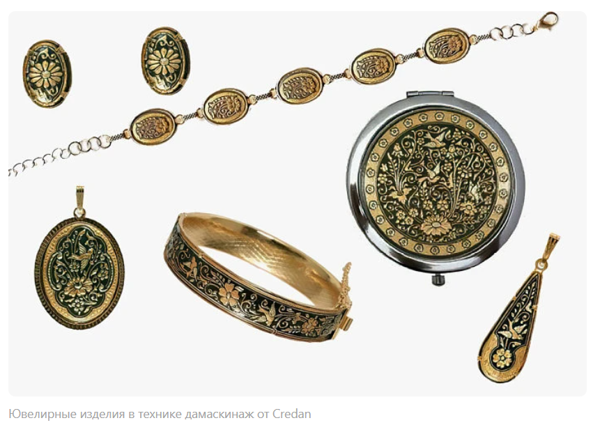 Наверняка, многие слышали про «толедское золото» — хотя это и золото и не золото одновременно. Речь идет об изделиях, выполненных в старинной технике дамаскинаж. Смысл ее в следующем на стальную поверхность наносят узор, затем в него вкладывают тонкие золотые или серебряные проволочки (либо тонкие пластинки), далее изделие подвергают окислению — обрабатывают определенным составом и запекают при высокой температуре. После такой обработки узор из драгметалла становится выпуклым и ярким — получается и скульптура и гравировка одновременно, а сталь становиться черной. В результате создается красивейший контрастный узор.