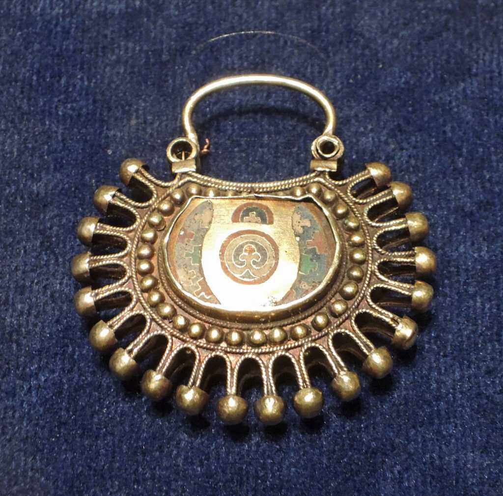 С нижнего луча свисает подвеска — римская гемма 2 века н. э., с выгравированным изображением Артемиды