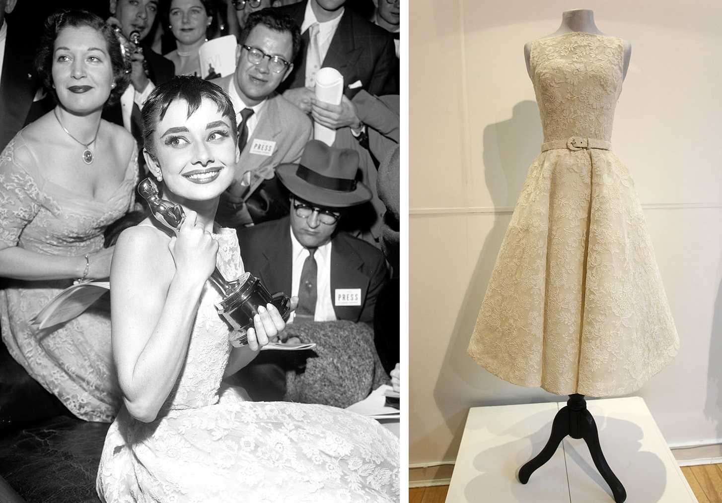 Слева — актриса в 1954 году на церемонии вручения «Оскаров»; справа — платье, которое Одри Хепберн надевала в тот вечер