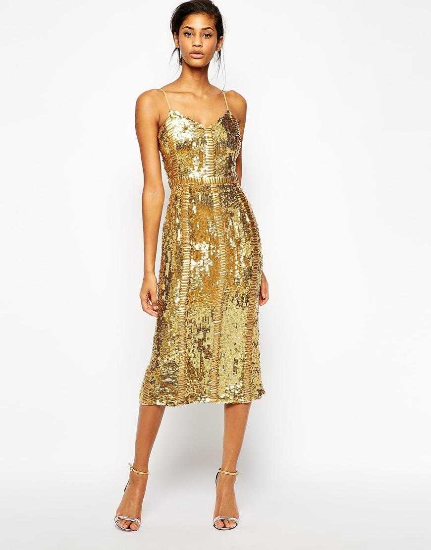 Платье из золотой ткани является очень ярким и самодостаточным предметом женского вечернего гардероба.