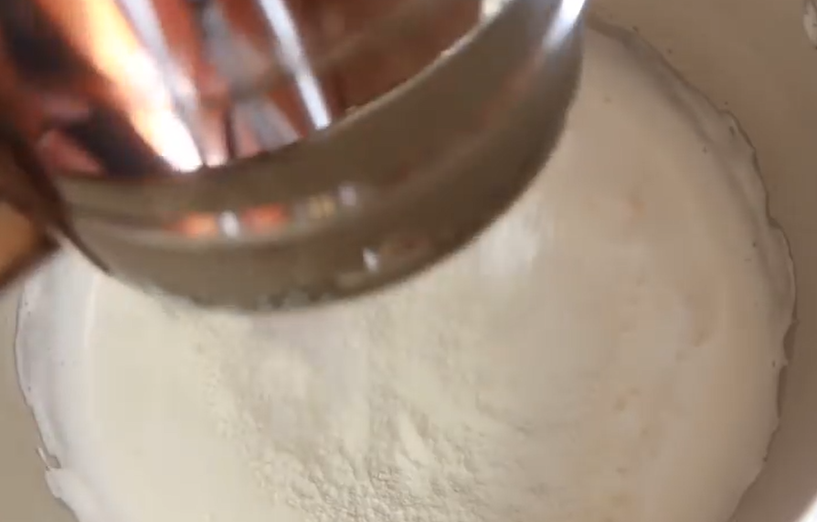 4. Пришла очередь добавить муку. Ее мы предварительно просеиваем через сито и постепенно вводим к яйцам. Миксер при этом продолжаем непрерывно работать.