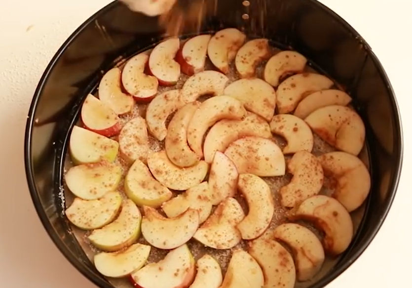 Шаг 8. Аккуратно украсьте пирог оставшимися дольками яблок, присыпав их сверху небольшим количеством корицы (можно немного присыпать яблоки сахарным песком).