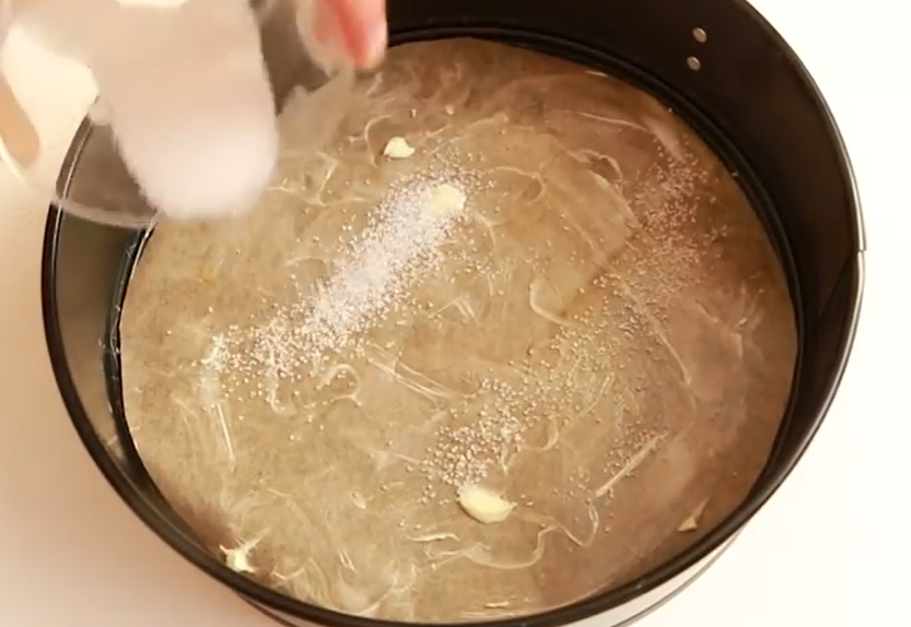 Шаг 7. Возьмите форму для выпечки диаметром 22 сантиметра. Смажьте дно и бока формы сливочным маслом и вылейте половину теста в форму. Сверху выложите дольки яблок в хаотичном порядке (примерно 1/3 яблок оставьте для украшения верха пирога), посыпьте их корицей и залейте оставшейся частью теста.