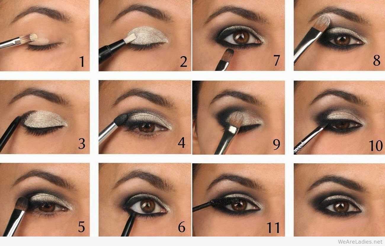 Пошаговое исполнение вечернего макияжа для карих глаз представлено на фото: