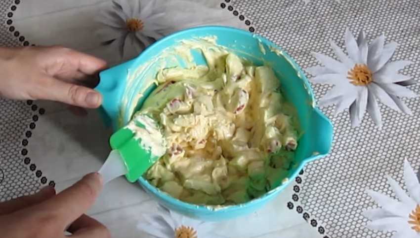 3. Яблоки очистите от кожуры и семян и порежьте на кубики. Соедините кусочки яблок с основой, аккуратно перемешайте ложкой.