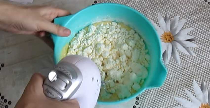 2. Введите муку. Добавьте творог и перемешайте на невысоких оборотах миксера. Добавьте разрыхлитель и всё хорошо смешайте.