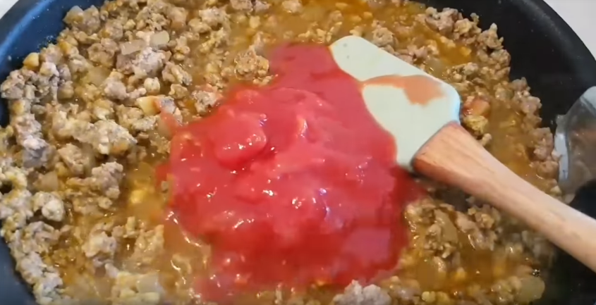 3. Затем добавляем к фаршу томатную пасту, пол стакана теплой воды и тушим еще 10 минут не закрывая крышкой.