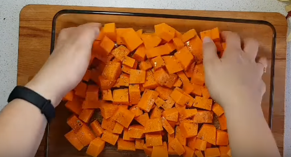 1. Тыкву очищаем от кожуры и семян, нарезаем мелкими кубиками (приблизительно в 1-1,5см) и выкладываем ее на противень или в форму. Наливаем пару столовых ложек сливочного масла, солим, перчим и перемешиваем. Отправляем форму в духовку, разогретую о 180 градусов на 40-45 минут.