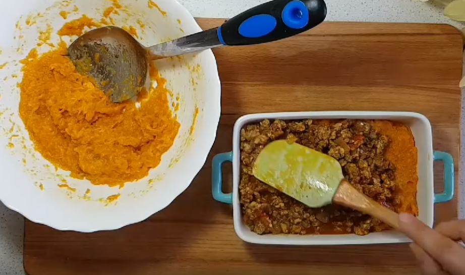 5. Собираем запеканку. На дно формы для запекания выкладываем половину тыквенного пюре, затем равномерно выкладываем все мясо и закрываем его второй половиной пюре.