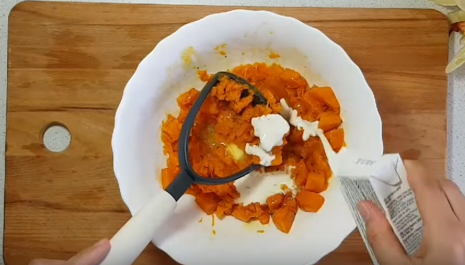 4. Приготовившуюся тыкву выкладываем в тарелку и разминаем ее до состояния пюре, добавив к ней сливки и растопленное сливочное масло. Когда сливки впитаются, засыпаем панировочные сухари и еще раз перемешиваем.