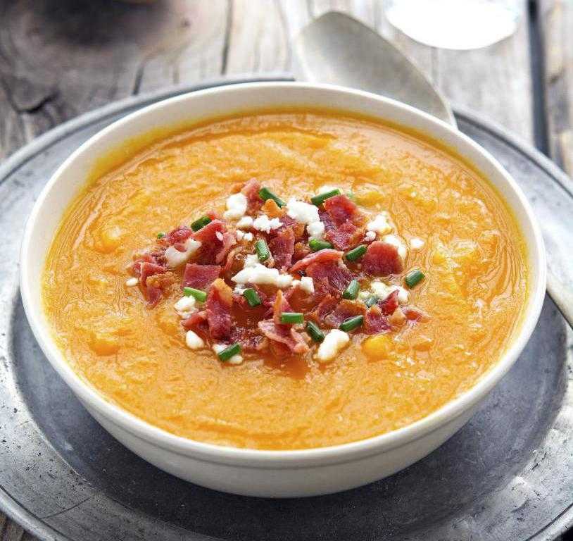 Почищенную и порезанную тыкву выкладывают в кастрюлю, дополняют тертой морковкой, заливают бульоном и варят около двадцати минут с момента закипания. Затем овощи обрабатывают блендером, подсаливают, перчат, дополняют сметаной, пассерованным луком, обжаренным беконом и рубленой зеленью.