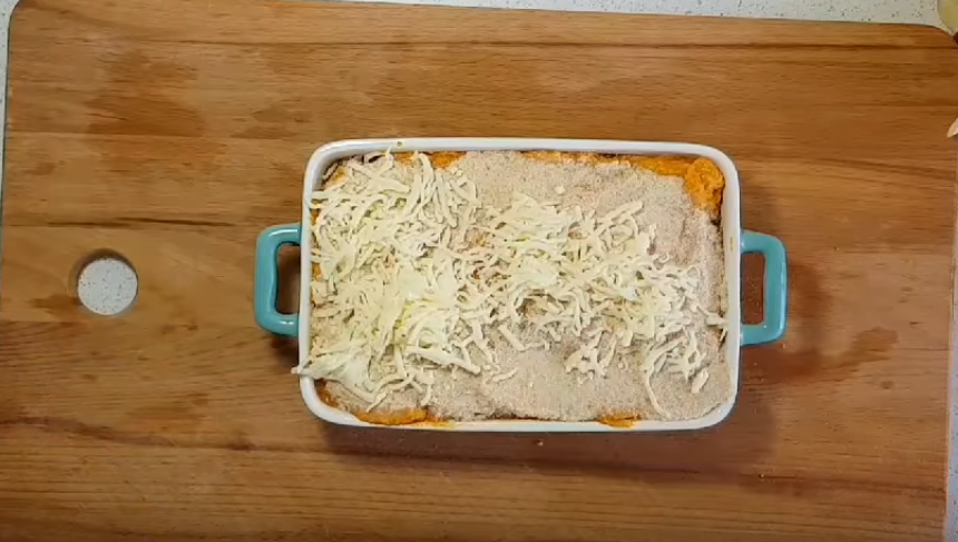 6. Сверху наносим сухари небольшим слоем и натираем сыр.