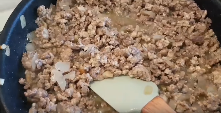 2. Фарш обжариваем с луком и чесноком до готовности. Не забываем его посолить и поперчить. При желании можно добавить других любимых приправ.