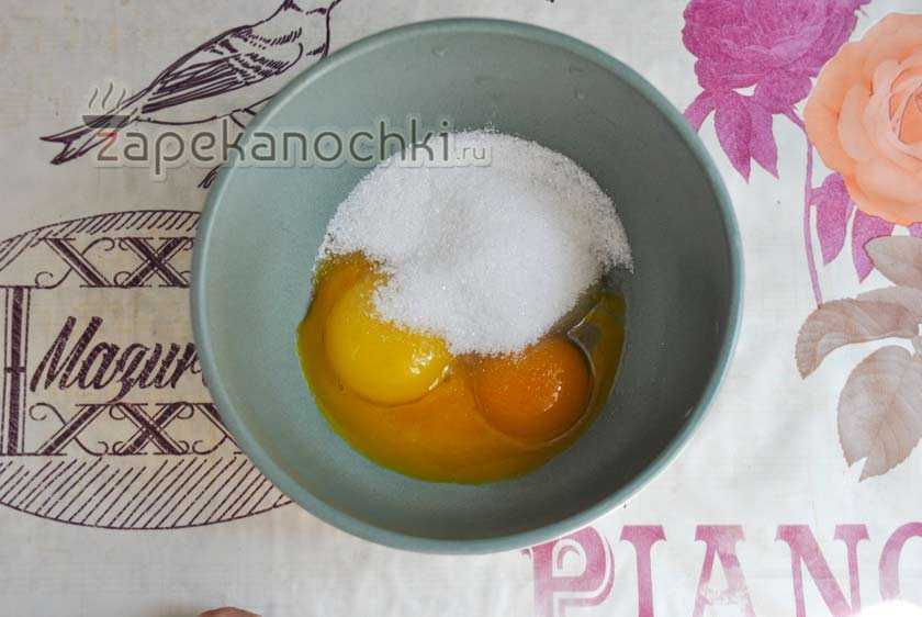 2. В глубокой чаше смешиваем 2 яйца, добавляем соль и сахар. Взбивать необязательно, просто хорошо размешиваем все ингредиенты.