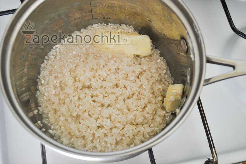 - Добавить промытую рисовую крупу, обжарить до появления блестящей корки.