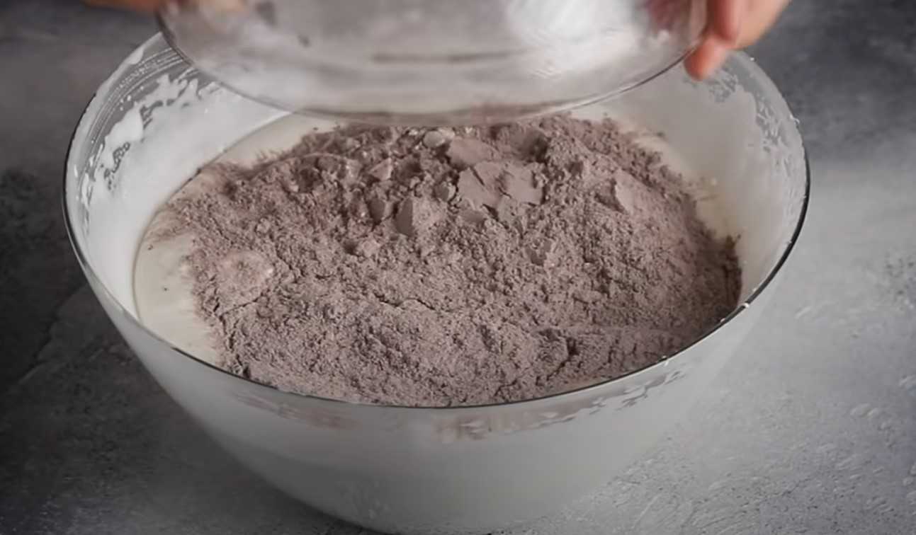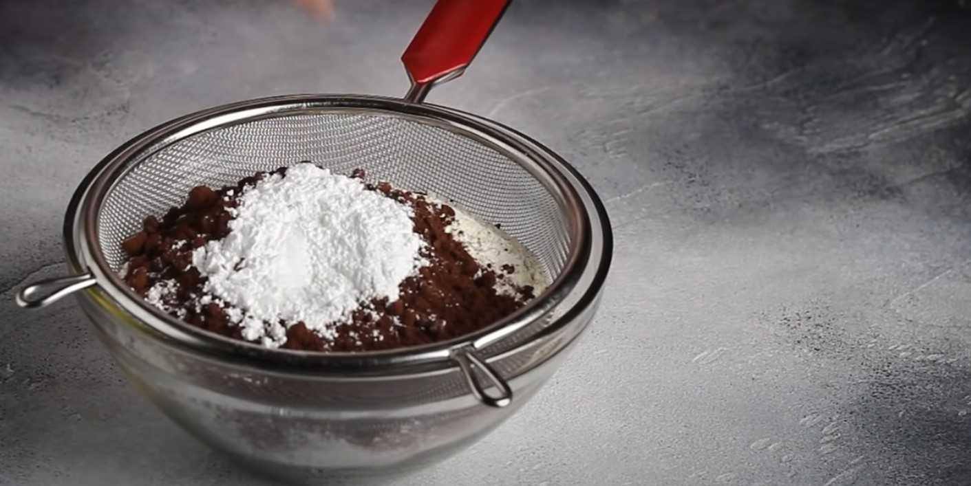 - Соединить муку, разрыхлитель и порошок какао – просеять эту смесь через небольшое ситечко.