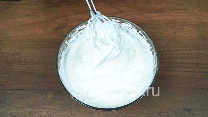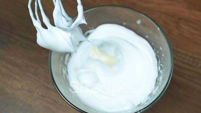 Начинаем взбивать белки на низкой скорости миксера до получения легкой пышной пены. Затем увеличиваем скорость, понемногу всыпаем половину сахара и взбиваем до жестких пиков.