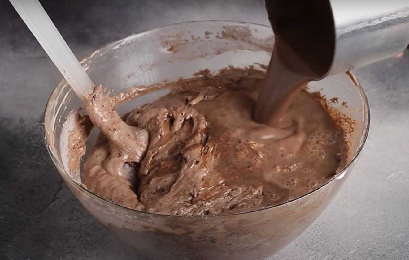 Теперь по очереди начинаем собирать все компоненты в одну ёмкость. В блюдо с растопленным шоколадом выкладываем масляный крем. Следом пойдёт пакетик ванили, измельчённые орехи и мука. Последним этапом станет постепенный ввод белковой части. Тесто помещаем в форму, ставим в духовку и выпекаем полчаса при 180°С.