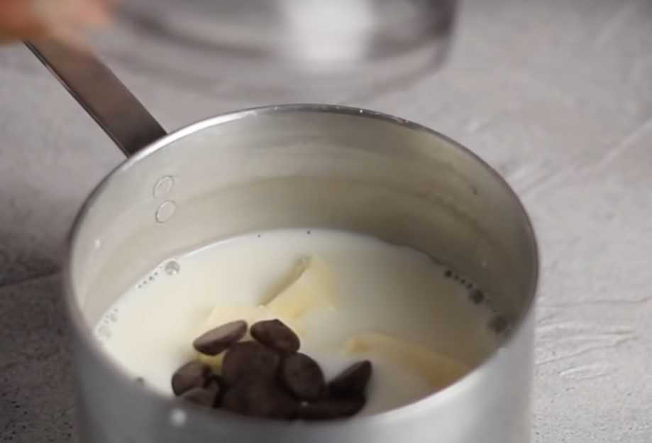 Молоко, сливочное масло и шоколад соединяем в отдельном сотейнике и ставим на небольшой огонь до получения однородной массы.