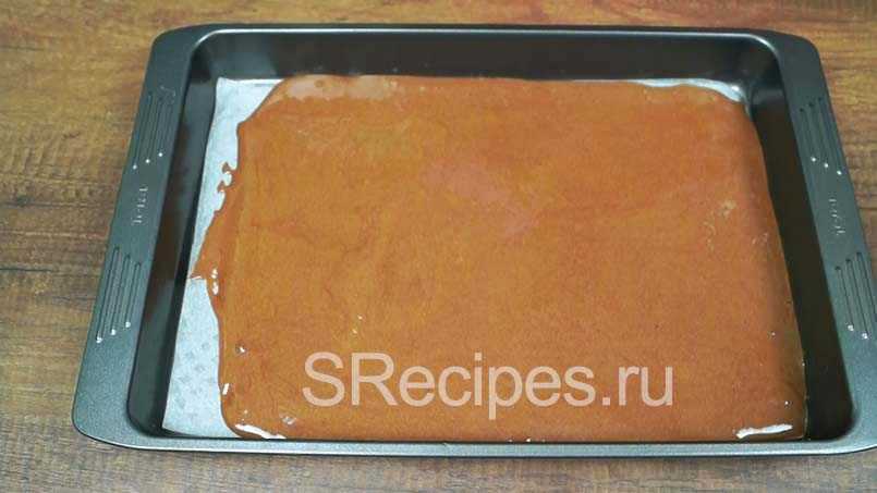 Выливаем тесто на застеленный пергаментом противень и равномерно распределяем.