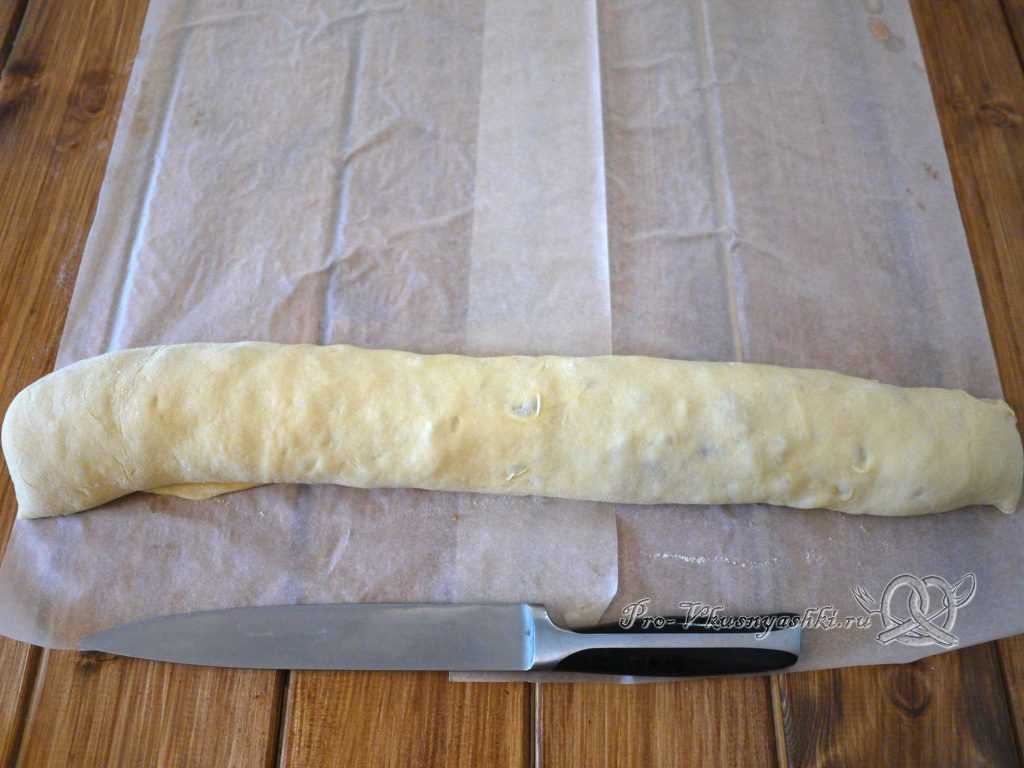 Шаг 9. Сверните в рулет. Разрежьте посередине, сверните в косичку, а потом закрутите в булочку.