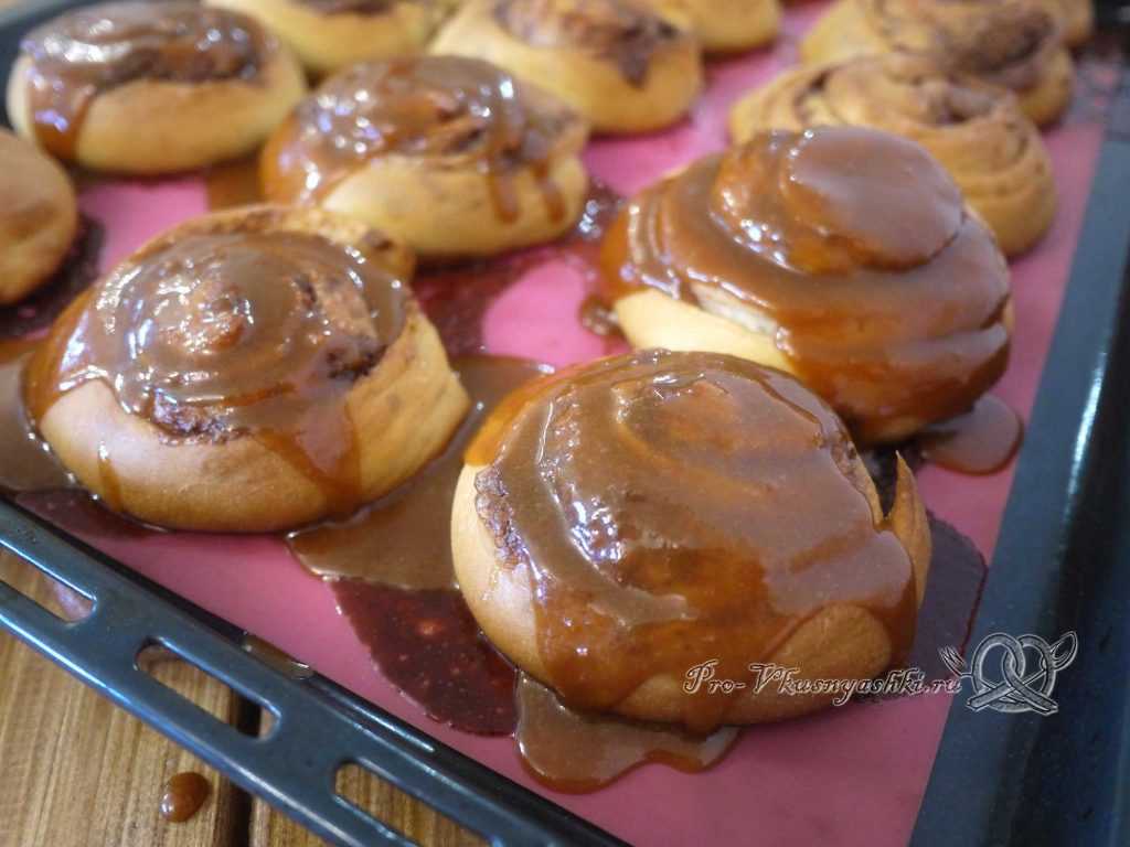 22.Сразу же смажьте булочки глазурью с помощью кисточки. При этом сдоба должна быть слегка теплой, не горячей, иначе глазурь будет таять и стекать.