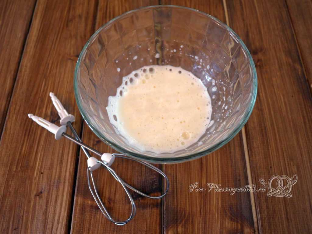 4.Вливайте в яйца молоко небольшими порциями и активно перемешивайте венчиком, чтобы яйцо не свернулось и не образовались комки.