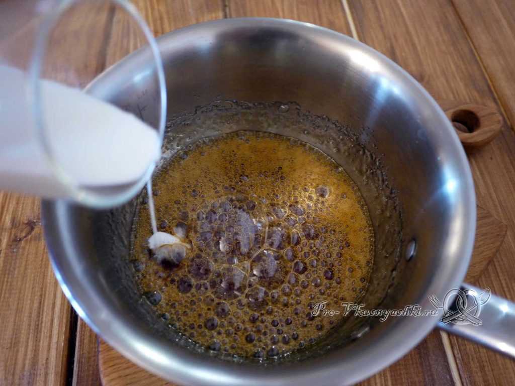 9.Налейте оставшееся теплое молоко и ложкой размешайте жидкие компоненты.