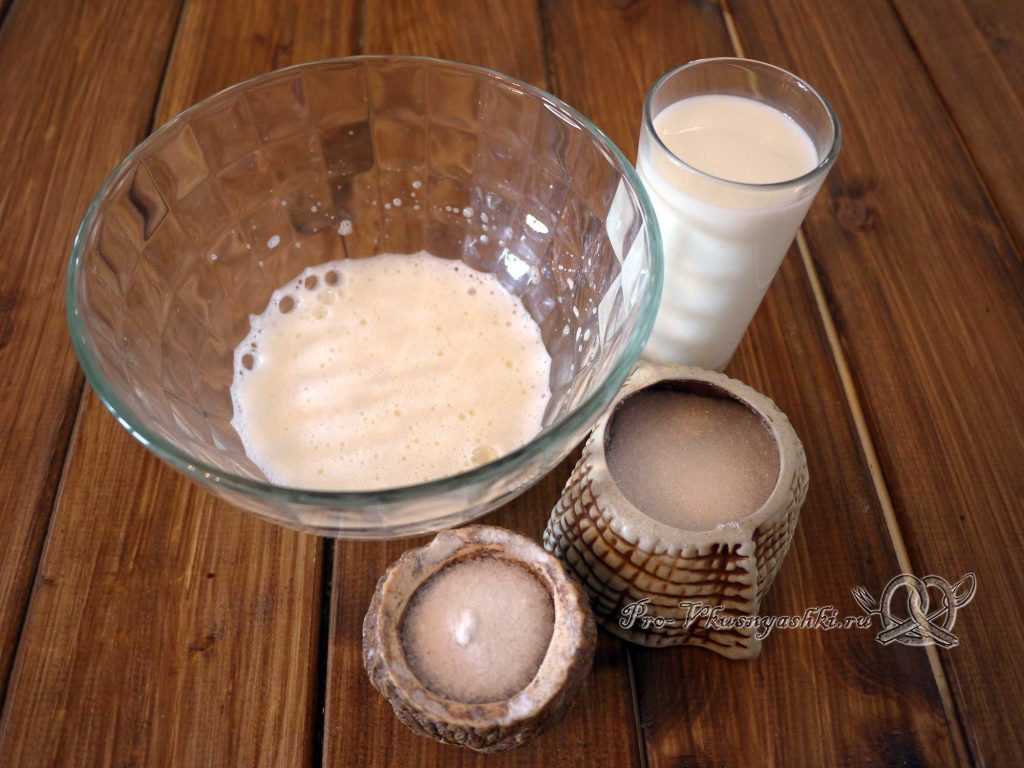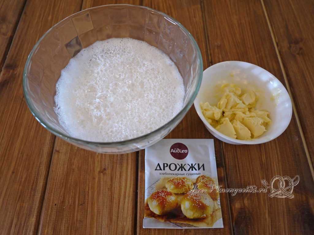 1.Как это бывает чаще всего, нужно сделать опару. Налейте половину нормы молока (125 мл), в него положите столовую ложку сахара из общего количества для теста и высыпьте сухие дрожжи.