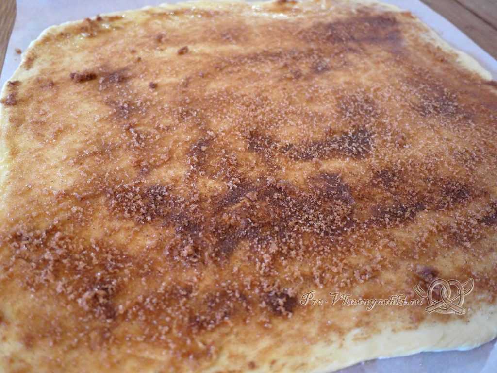 При желании сверху масла можно посыпать сахаром, но в тесте у нас достаточно сладости и сверху тоже будет сахарная присыпка, поэтому я не сыпала. Итак, как завернуть булочки с сахаром? Загните один длинный край внутрь.