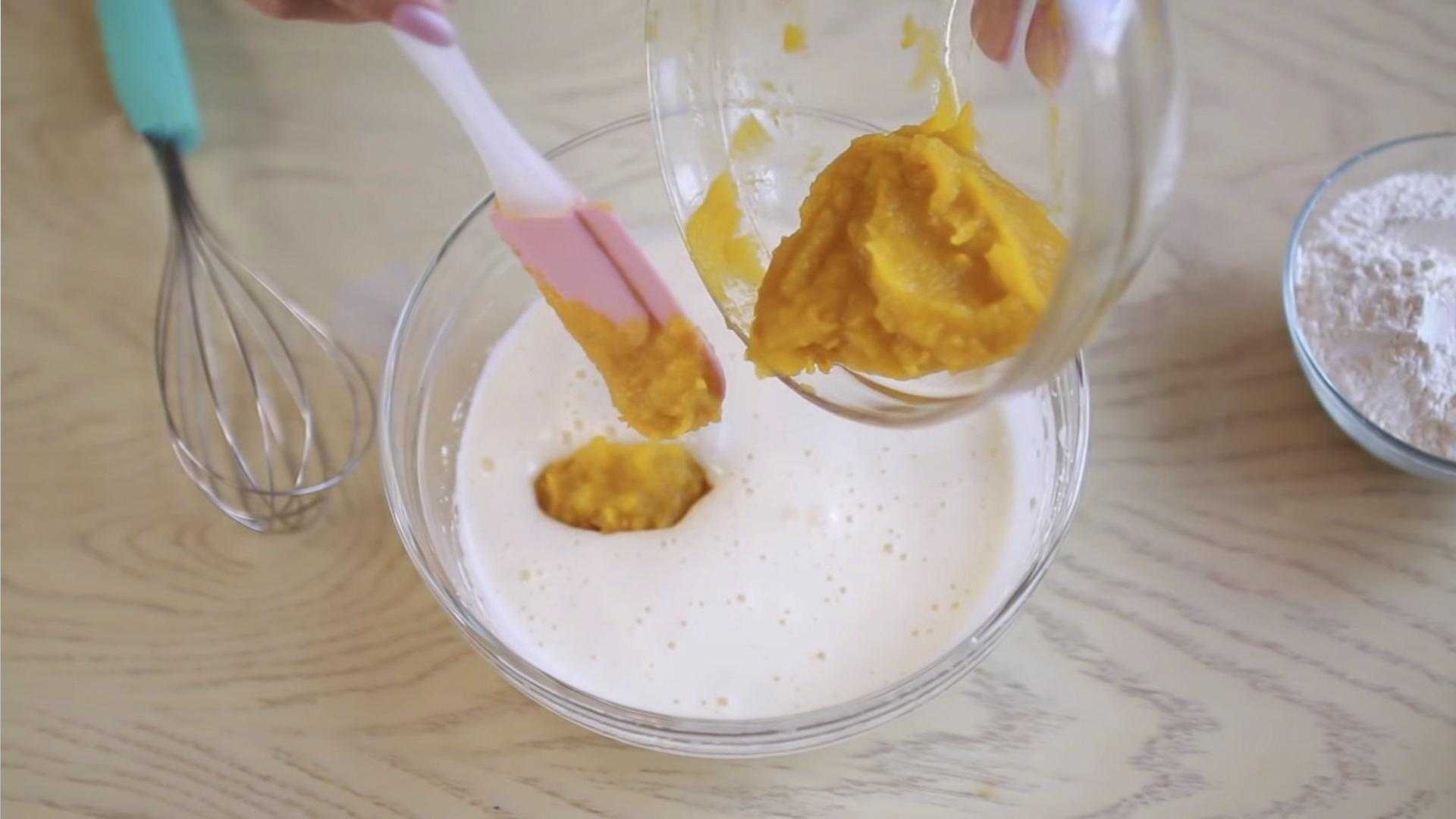 Добавьте в миску тыквенное пюре и ванильный экстракт и взбивайте до тех пор, пока тесто будет выглядеть как густая простокваша.