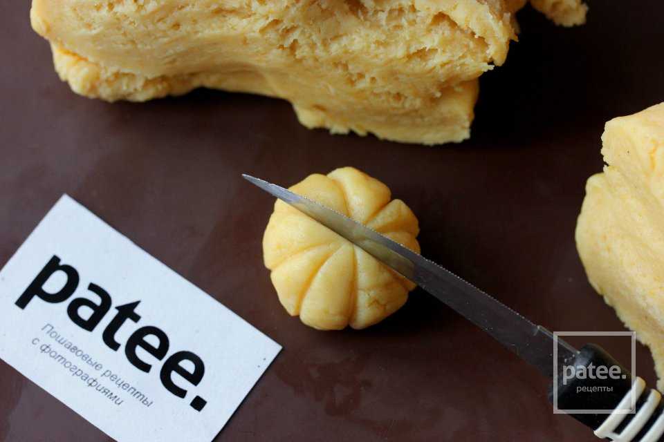 Тупой стороной лезвия ножа придаём шарику теста форму тыквы.