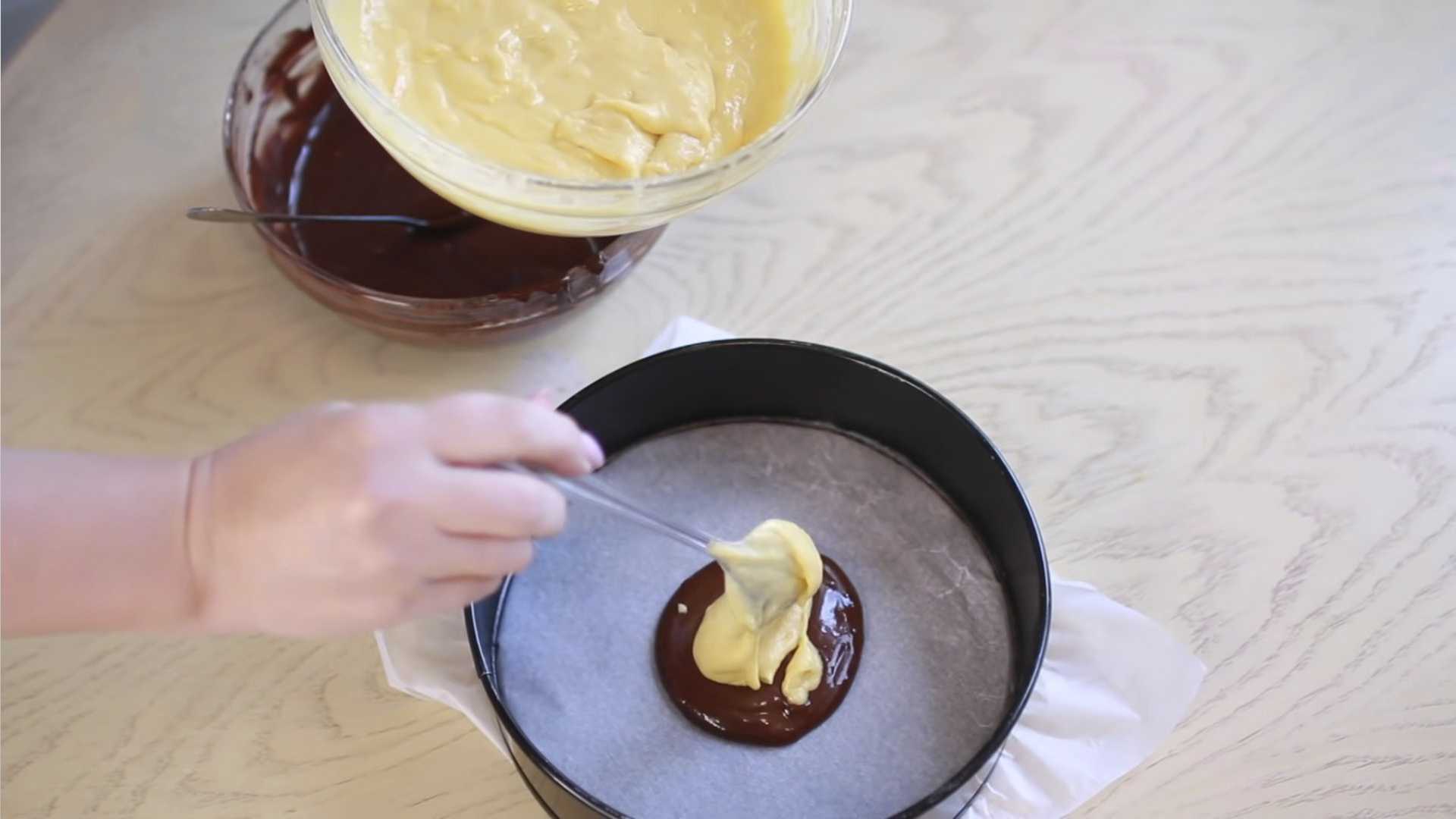 Можно испечь все тесто сразу, а затем разрезать пополам один высокий пирог. Но я советую вам разделить тесто пополам и испечь его в два приема. Так коржи лучше пропекутся.