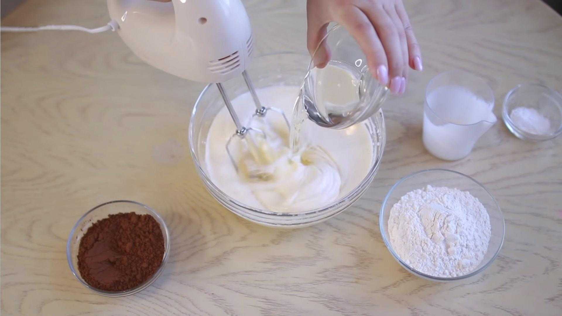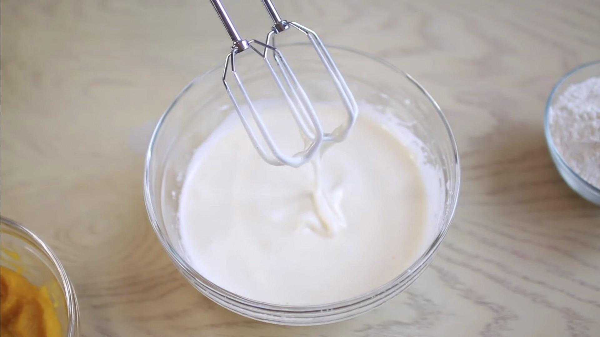 - Взбиваем белки до состояния воздушной пены. Частями добавляем в желтковую смесь и аккуратно перемешиваем.