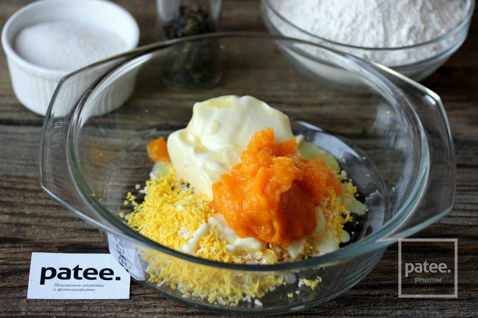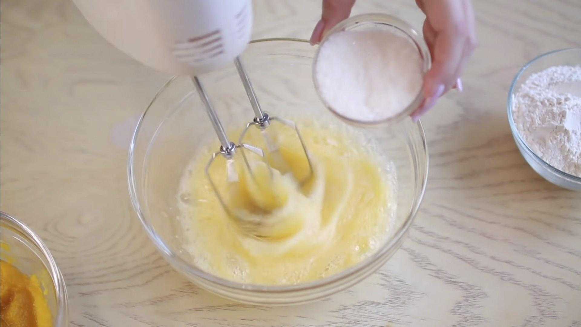 - Сахар с яйцами тщательно взбить добела, соединить с тыквенным пюре, размягченным маслом.