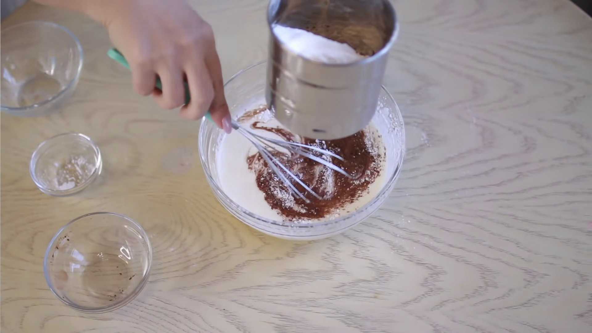 Добавьте мучную смесь и кефир частями поочередно в тесто, в три приема, начиная и заканчивая мучной смесью.