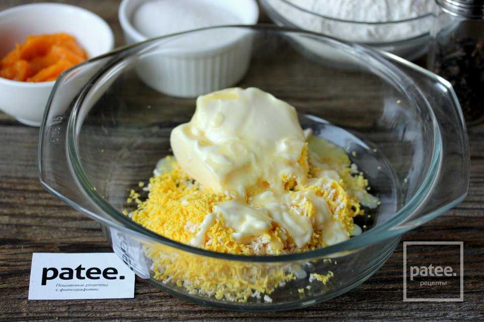 Отвариваем вкрутую куриные яйца, даём им остыть, очищаем от скорлупы и отделяем желтки от белков. Белки использовать мы не будем (их можно использовать для приготовления салата “Зелёный монстрик” http://www.patee.ru/recipes/salads/view/?id=312460), а желтки натираем на мелкой тёрке.