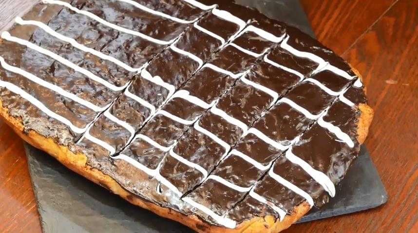 - Полить сверху теплой глазурью, разровнять ее и украсить растопленным белым шоколадом.