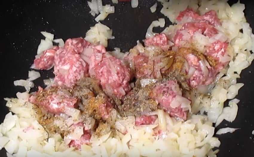 На раскаленную сковороду добавляем подсолнечное масло, выкладываем фарш и обжариваем несколько минут. Мелко-порубленный лук отправляем к мясу. Обжариваем все вместе около 10 минут. Солим, перчим по вкусу. Начинка готова и ее пока можно отложить.