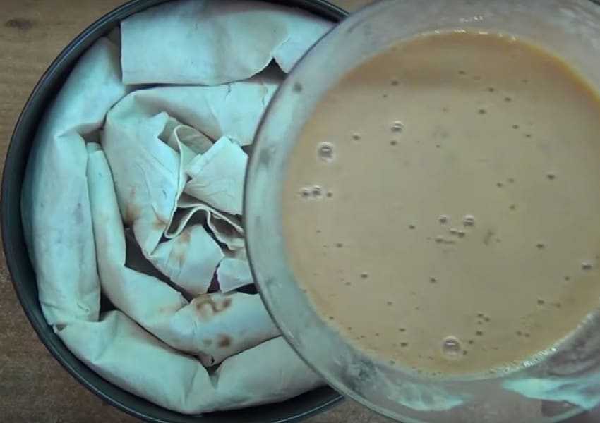 Ленивый пирог с фаршем из лаваша на жидком тесте из сметаны