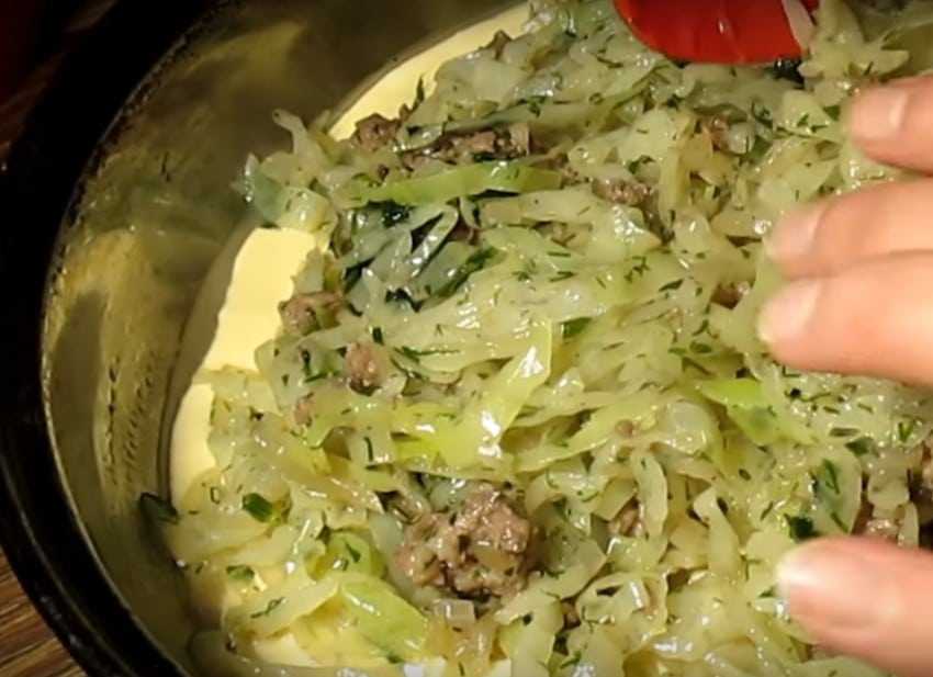 Наливной пирог с говяжьим фаршем и капустой на кефире с майонезом