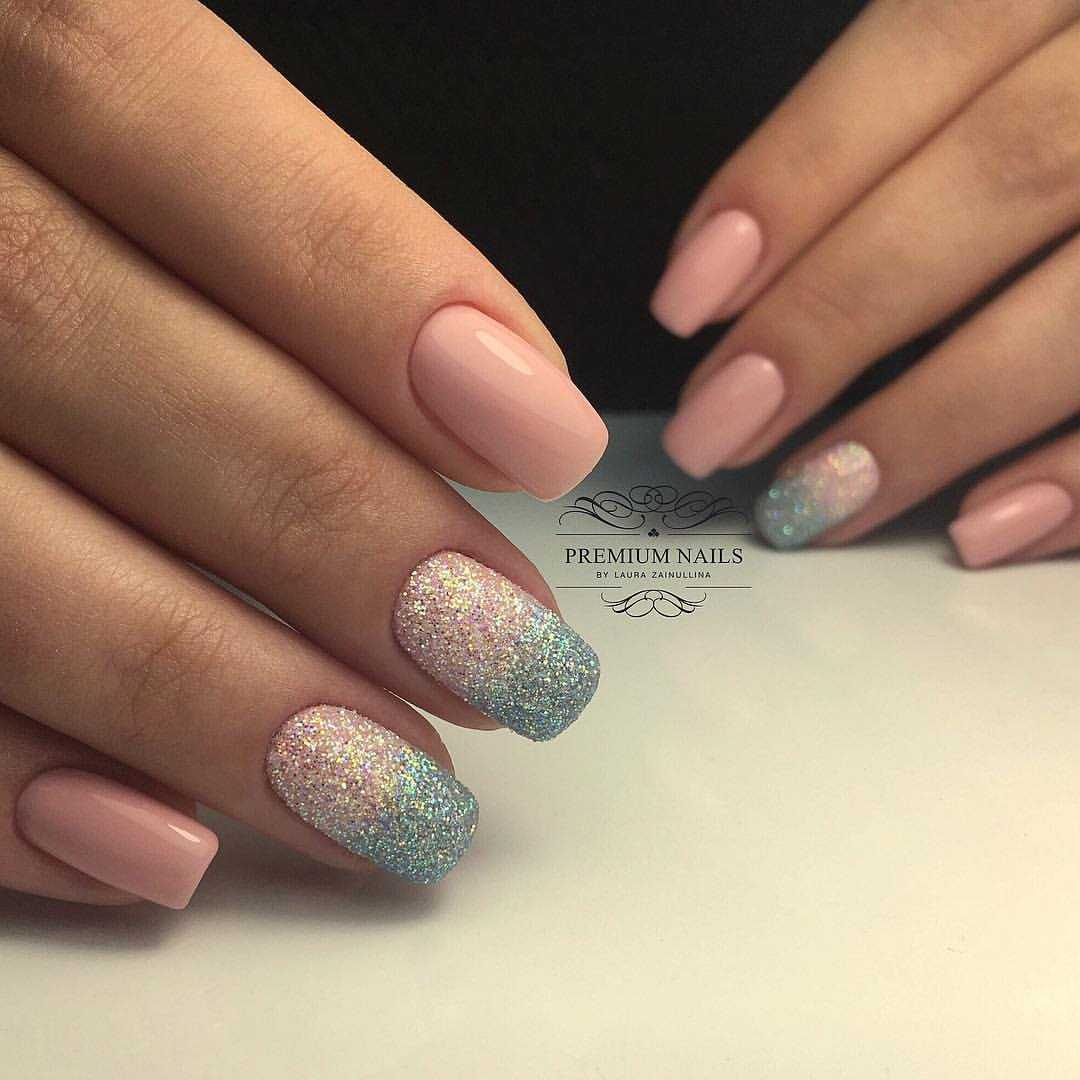 Праздничный — на пике популярности сегодня нейл-арт на прозрачном фоне. Можно сделать нежное розовое покрытие в 1 слой и нанести небольшое количество глиттера. Эффектно смотрится на указательном или безымянном пальце.