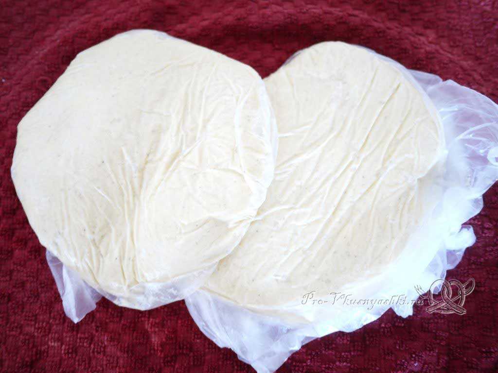 Делим мучную основу на две части в соотношении 1:3. К меньшей части добавляем 2 ст.л муки, так чтобы тесто приобрело крошливую консистенцию. Заворачиваем каждый кусок в целлофан и убираем на 1 ч в холодильник (или на 30 мин в морозильную камеру).