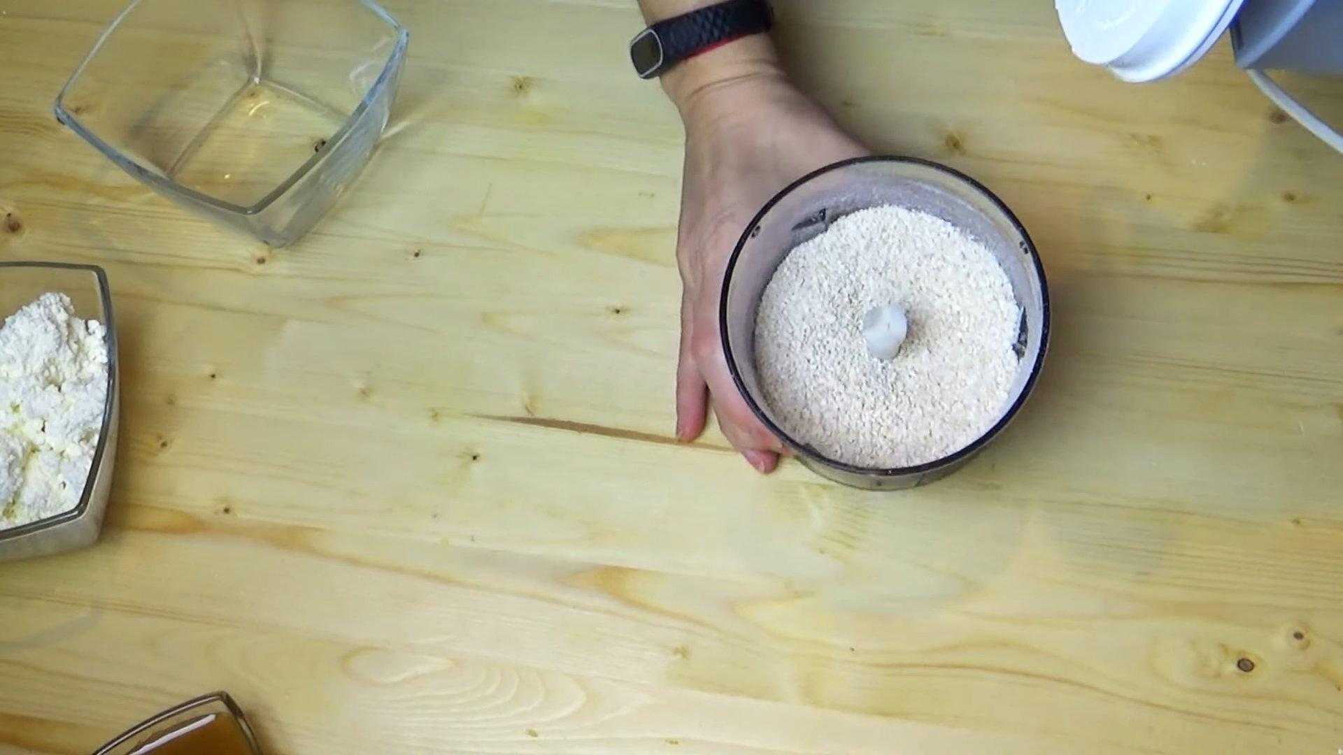 - Измельчите овсянку. Пересыпьте готовую крошку в посуду для замешивания теста.
