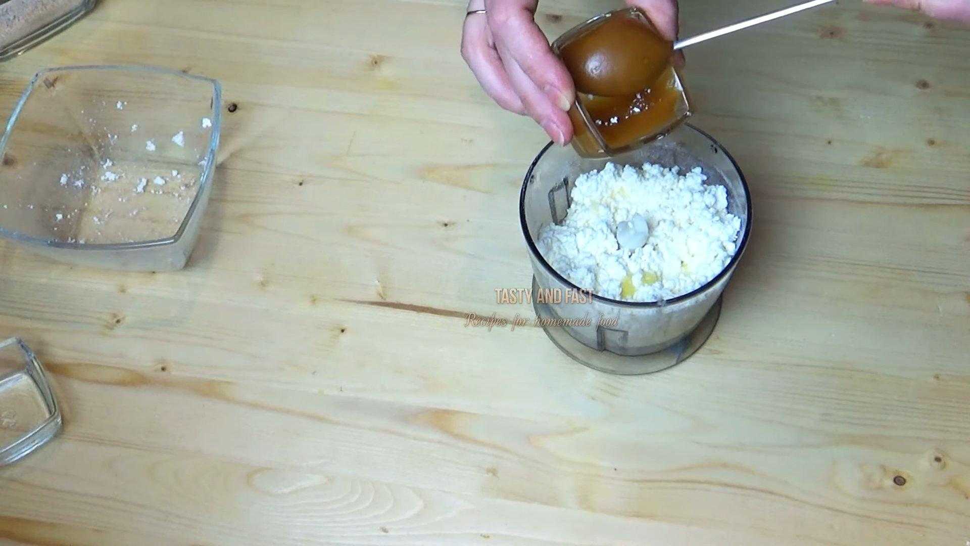 Творог перекладываем в чашу блендера, добавляем к нему лимонный сок, мед и хорошо взбиваем.