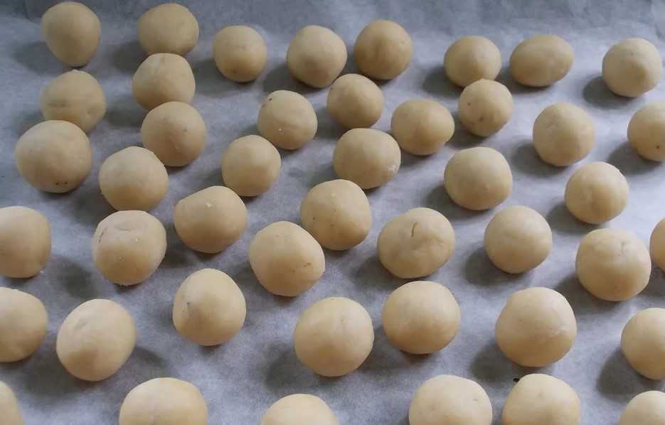 Из тщательно замешанного теста формируем вручную небольшие шарики, раскладываем на противне с бумагой для выпечки.